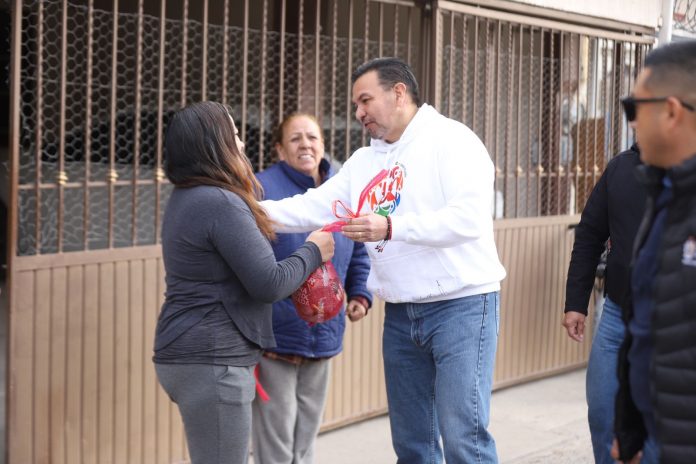 Ciudad Juárez.- El Presidente Municipal, Cruz Pérez Cuéllar, acompañado del personal de la Dirección General de Desarrollo Social acudió a la colonia Morelos Uno para entregar mil piernas de puerco, como parte de las acciones de apoyo a las familias para que cuenten con alimentos para esta navidad.