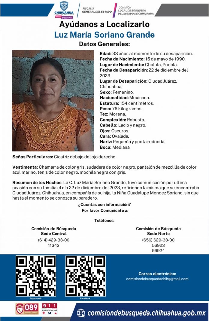 Luz María Soriano, vestía sudadera negra, chamarra gris, pantalón de mezclilla y tenis negro. Su estatura aproximada es de 1.50 metros, complexión mediana, tez morena y cabello largo ondulado.