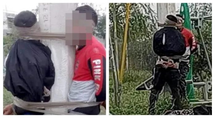 En redes sociales empezaron a circular imágenes donde se puede ver a los presuntos ladrones atados con cinta en la parte de la cabeza, torso y manos al poste de luz,para evitar que escaparan.
