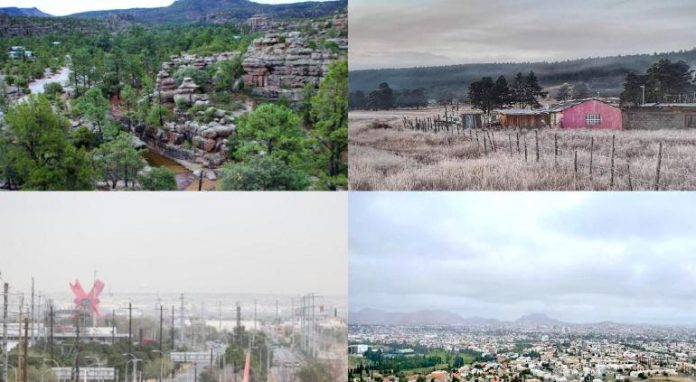 Las temperaturas máximas esperadas para esta tarde son (°C): Chihuahua 15, Juárez 12, Janos 12, Madera 10, Temósachic 11, Cuauhtémoc 11, Ojinaga 16, Delicias 15, Camargo 16, Jiménez 16/0, Parral 16, Creel 11, Chínipas 24, Guachochi 11, El Vergel 10.