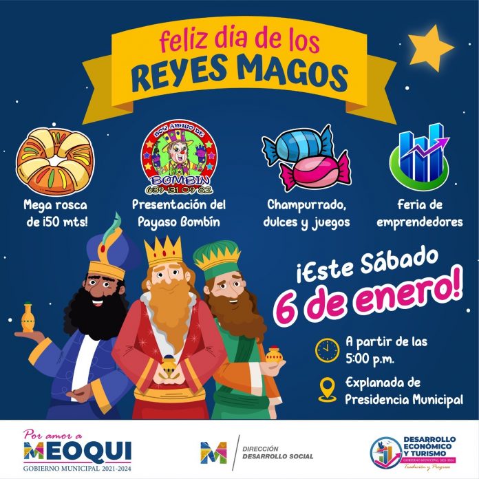 Meoqui.- Este sábado 6 de enero, en punto de las 5 de la tarde en la explanada de la Presidencia Municipal, se llevará a cabo el tradicional Festival de Día de Reyes Magos donde se contará con una mega rosca a cargo de la escuela de gastronomía L´Ecole du Chef, dulces, el Show del Payaso Bombín y Feria de Emprendedores.