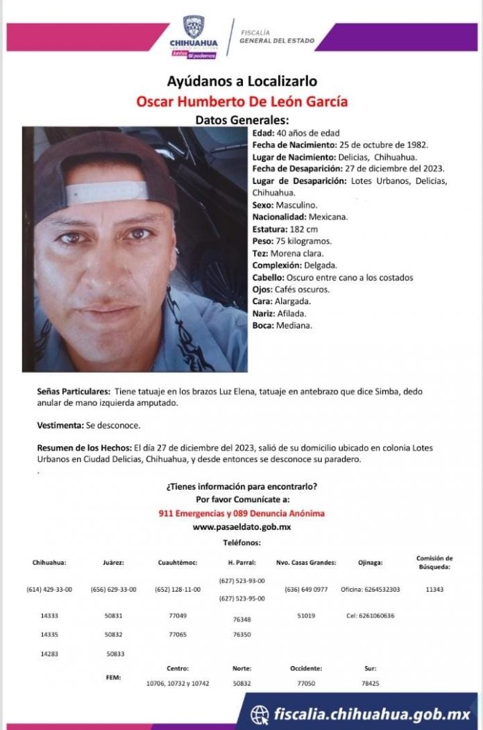 Resumen de los Hechos: El día 27 de diciembre del 2023, salió de su domicilio ubicado en colonia Lotes Urbanos en Ciudad Delicias, Chihuahua, y desde entonces se desconoce su paradero.
