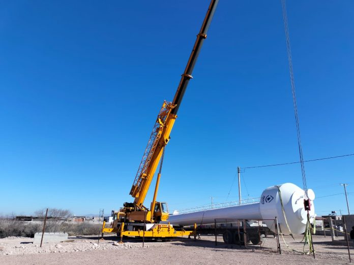 MEOQUI.- Luego del anuncio en meses pasados por parte de la alcaldesa Miriam Soto y personal de Conagua y JMAS, este domingo se realizó el levantamiento del tanque elevado en la Colonia Tricentenario, donde se continuará con la instalación de la red de distribución hidráulica y así, dar servicio a las 135 familias de la comunidad.
