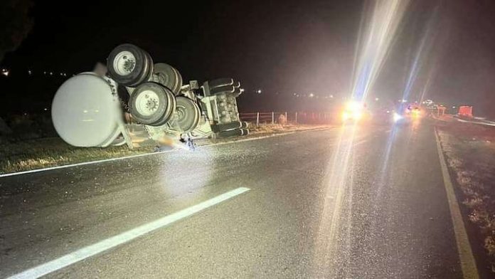 SAUCILLO.- Un aparatoso accidente se registró la madrugada de este lunes, al volcar una pipa cuyo tanque trasladaba gasolina; hechos registrados en la carretera Federal, a la altura de la caseta de peaje.