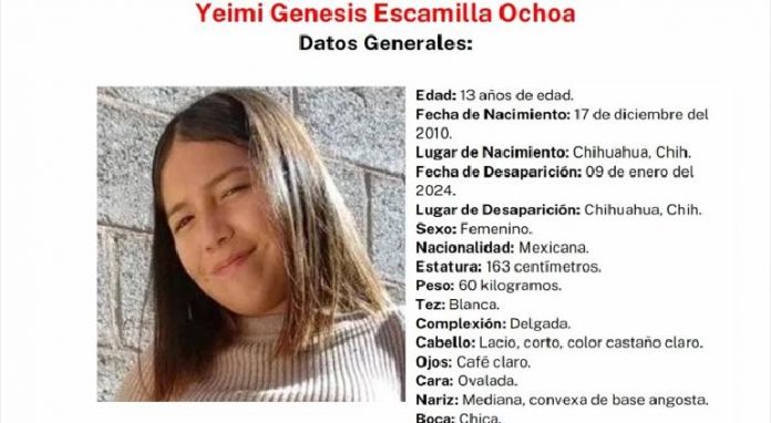 Chihuahua.- La menor Yeimi Génesis Escamilla Ochoa, de 13 años de edad, desapareció en la ciudad de Chihuahua el martes 9 de enero del presente.