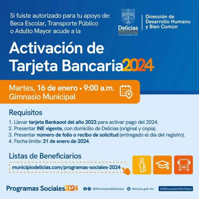 Agregó que también pueden revisar las redes sociales oficiales del municipio, así como en la página web www.municipiodelicias.com, para luego recibir la tarjeta bancaria, el 16 de enero, en el Gimnasio Municipal, de 9 de la mañana a 5 de la tarde.