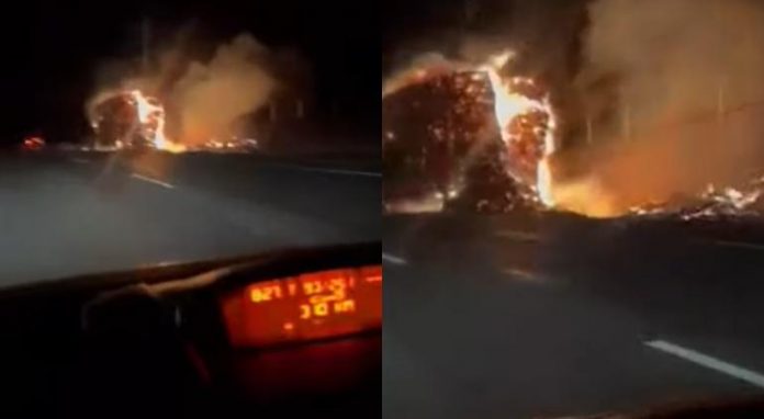 En el video de poco más de trece segundos se puede ver como la carga ardía junto a la carretera, sin embargo la plataforma ya no estaba enganchada al tráiler.