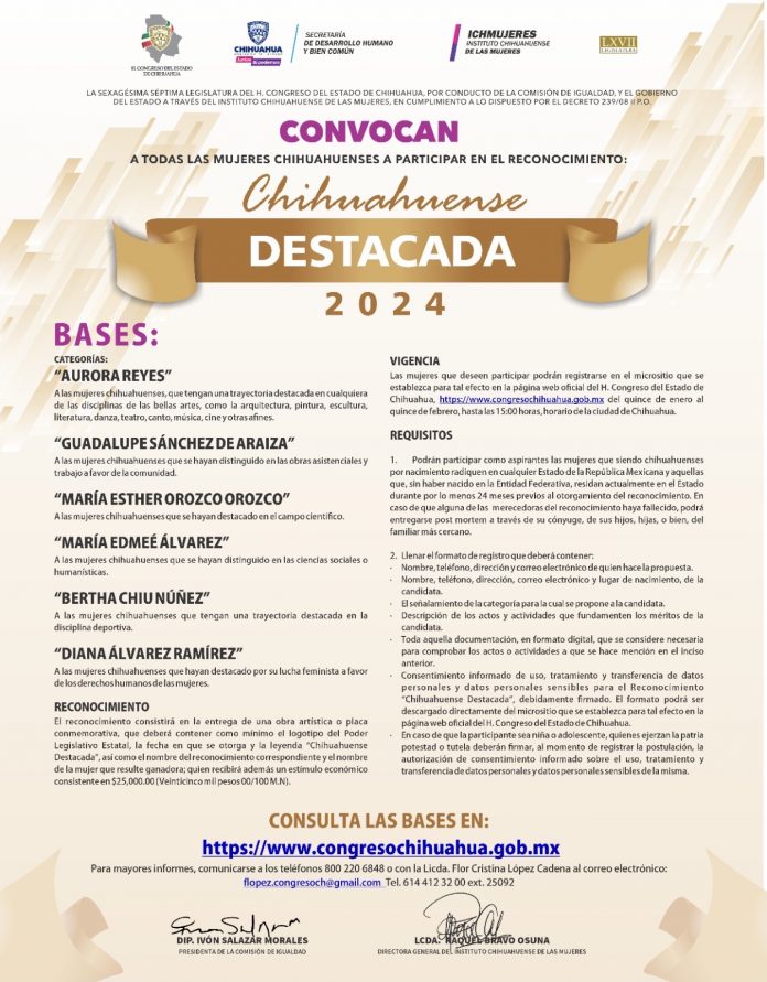 “La invitación es para que nos ayuden a buscar esas chihuahuenses destacadas que habitan en nuestro municipio, para hacer la nominación y esperemos que tengamos no una sino varias ganadoras”, comentó la directora quien dio a conocer que, para más información, pueden consultar la página: https://www.congresochihuahua.gob.mx/micrositios/chihuahuensedestacada/2024/