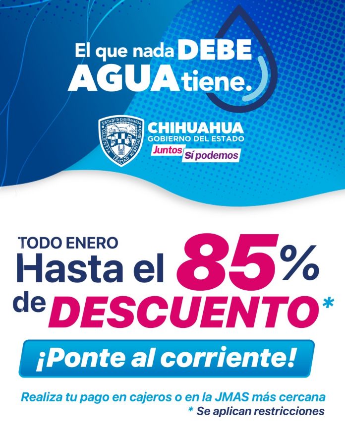 Delicias.- Para apoyar a los usuarios con adeudos de agua, el programa “El que Nada Debe Agua Tiene” brinda descuentos de hasta un 85 por ciento en la regularización de cuentas durante todo el mes de enero. Esta medida tiene como objetivo principal facilitar la regularización de cuentas pendientes y aliviar la carga financiera de las familias de Delicias.