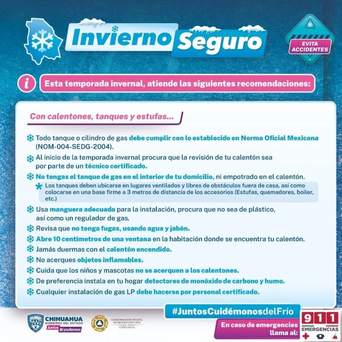 Chihuahua.- Con el objetivo de promover la seguridad y evitar percances en los hogares chihuahuenses, la Coordinación Estatal de Protección Civil (CEPC), exhorta a la ciudadanía a mantener las medidas precautorias para prevenir accidentes por el uso de calentones.