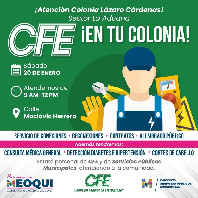 Meoqui.- El programa “CFE en tu Colonia” llegará a la zona conocida como La Aduana en el seccional de Lázaro Cárdenas este sábado 20 de enero, en un horario de 9 de la mañana a 12 de la tarde, donde la ciudadanía podrá atender temas como conexiones, reconexiones, contratos y alumbrado público, contando además con la presencia de la alcaldesa Miriam Soto y todo su gabinete, para escuchar las peticiones de la ciudadanía entre otros servicios implementados por el Gobierno Municipal.