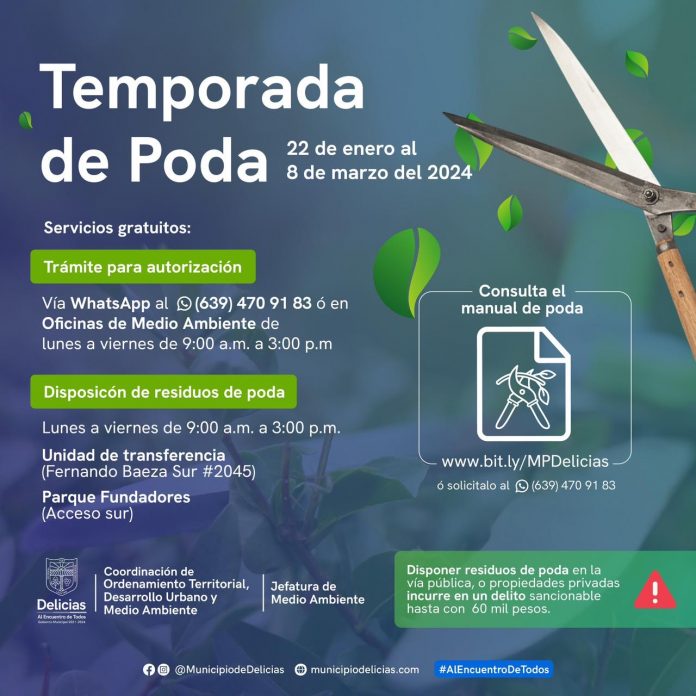 Delicias.- El Gobierno Municipal de Delicias, encabezado por el alcalde Jesús Valenciano García, anunció que este 22 de enero inició oficialmente la temporada de poda en el municipio con la que podrán realizar las modificaciones y mantenimiento a los árboles que hay en sus propiedades, según informó el jefe de Medio Ambiente, Juan Carlos Torrecillas López.