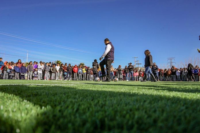 Delicias.- En un evento que reunió a padres de familia, directivos, estudiantes y autoridades locales, el presidente municipal Jesús Valenciano García presidió la inauguración de la nueva cancha de fútbol de pasto sintético en la escuela primaria “Salatiel Castañeda”.