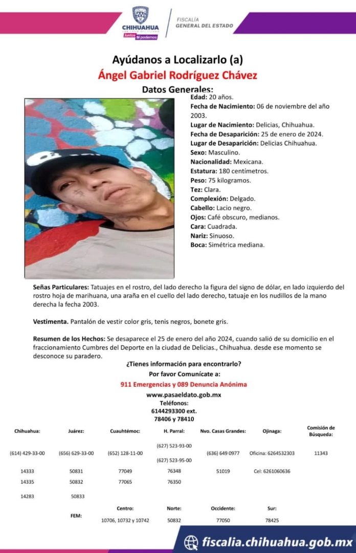 Delicias.- La FGE lanzó un comunicado en busca de Ángel Gabriel Rodríguez Chávez de 20 años de edad, desaparecido en ciudad Delicias.