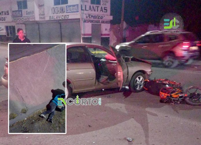 Delicias.- Los accidentes no seden, a temprana hora de este lunes un choque más se dio entre el conductor de una motocicleta y un auto particular, el guiador de la moto salió proyectado por varios metros quedando tendido al interior del canal revestido.