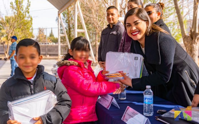 Meoqui.- “Como gobierno local le apostamos a la educación, lo vamos a seguir haciendo, es un pilar fundamental y tenemos que hacer la parte que nos corresponde desde el Gobierno Municipal” así lo dijo la alcaldesa de Meoqui, Miriam Soto, luego de realizar la entrega de 90 kits de útiles, con artículos escolares básicos, a los alumnos de la Escuela Primaria Fray Pedro de Gante en la comunidad de Los García, en el seccional de Guadalupe Victoria.