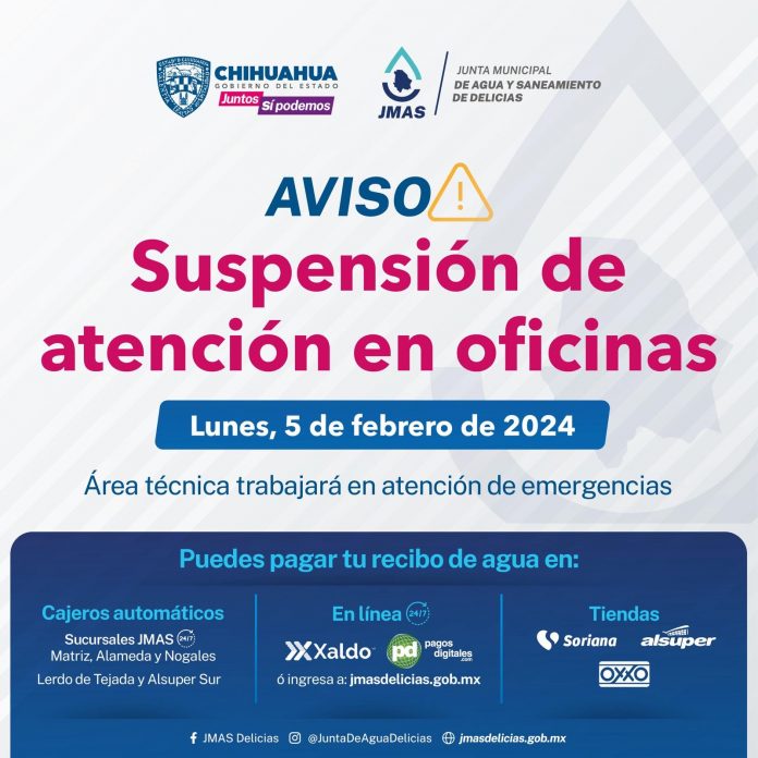 Delicias.- La Junta Municipal de Agua y Saneamiento de Delicias informa a todos sus usuarios que el próximo lunes 5 de febrero, las oficinas de atención al público permanecerán cerradas. Sin embargo, el área Técnica estará operativa para atender emergencias relacionadas con el suministro de agua.