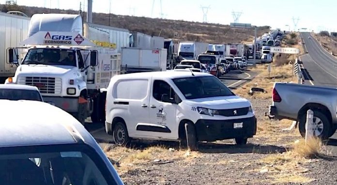 Cerca de 100 transportistas utilizaron trailers y otros camiones para bloquear la carretera Chihuahua-Delicias a la altura de MADINSA.