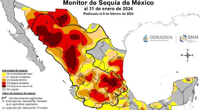 Conagua explicó en su informe que la “sequía extrema y excepcional persiste en el noroeste, noreste y centro” del país y “ocupa el 28.98% del país principalmente”.