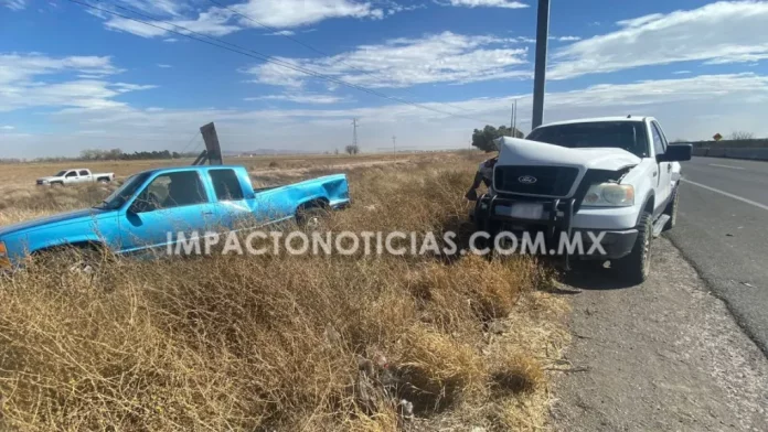 Meoqui.- Un aparatoso choque alcance entre dos pick up que se registró sobre la carretera federal, a la altura del puente de Estación Consuelo, generó daños materiales de consideración, pues luego de la colisión, los dos se precipitaron hacia la orilla derecha, quedando una de ellas sobre un camino de terracería, donde, pese a lo aparatoso del choque, no se registraron personas lesionadas.