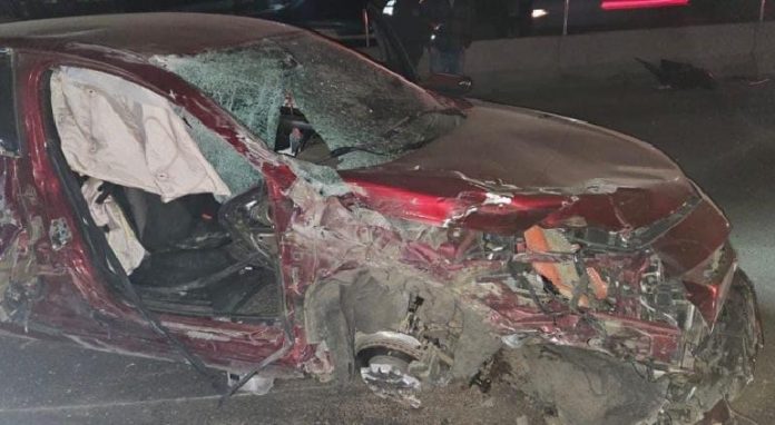 Chihuahua.- Un aparatoso choque se registró a la altura del kilómetro 28 del Corredor Comercial, en Cuauhtémoc, Chihuahua. Un automóvil Chevrolet de color guinda, quedó completamente destrozado.