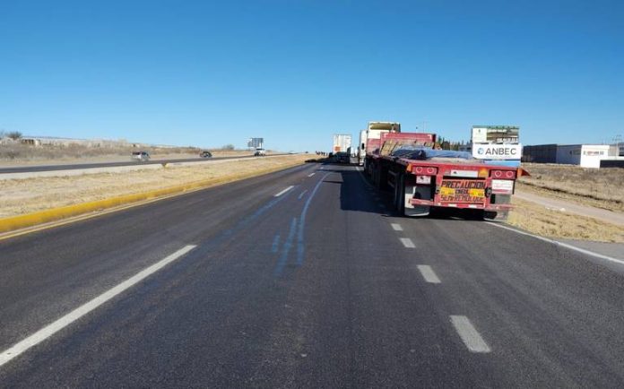 Chihuahua.- La fila de tráileres y autos varados por el bloqueo en la caseta a Sacramento, llega a los 7 kilómetros de longitud.