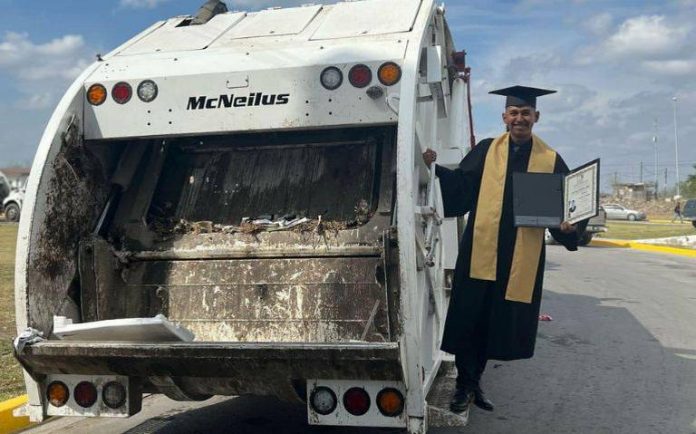 Se trata de José Israel Hernández Chávez, de 21 años de edad, quien forma parte de las cuadrillas de recolección de basura municipal, y que recientemente compartió en sus redes sociales la noticia e imágenes de su reciente graduación.