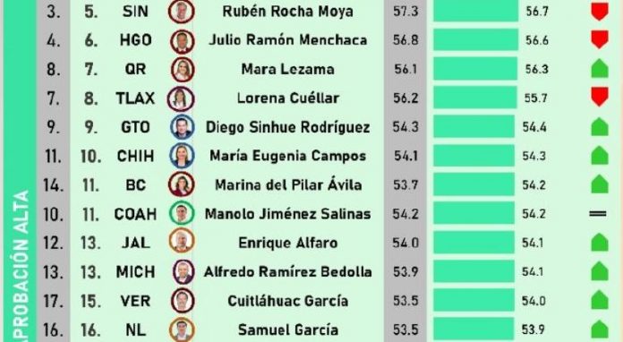 Luego, los otros 5 con mayor aprobación fueron: Julio Ramón Menchaca de Hidalgo con 56.6%; Mara Lezama de Quintana Roo con 56.3%; Lorena Cuéllar de Tlaxcala con 55.7%; Diego S. Rodríguez de Guanajuato con 54.4%; y finalmente María Eugenia Campos de Chihuahua con 54.3% de porcentaje.