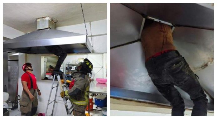 Cancún.- Un hombre intentó robar una pollería ubicada en Cancún, Quintana Roo, al intentar ingresar al negocio por la campana de ventilación de la cocina, quedó atorado con las piernas colgadas al querer bajar.