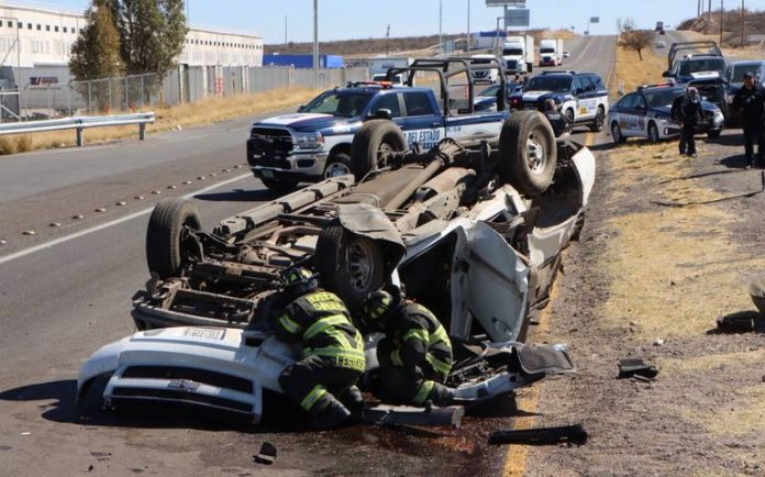Ciudad Juárez.- En la carretera a Ciudad Juárez, a la altura del kilómetro 28, se registró una volcadura, en donde dos agentes de la Policía del Estado, escoltas del director de Centros Penitenciarios de la SSPE, Ricardo Realivázquez, resultaron con lesiones de gravedad y el vehículo en el que viajaban, completamente destrozado.