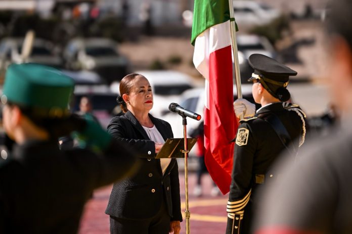 En representación de la gobernadora Maru Campos, la secretaria de Educación y Deporte, Sandra Elena Gutiérrez Fierro, destacó la importancia de promover, impulsar y preservar el fervor hacia los Símbolos Patrios, así como el amor al país.