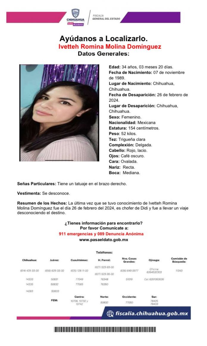 Chihuahua.- La Fiscalía General del Estado dio a conocer el reporte de desaparición de Ivetteh Romina Molina Domínguez, conductora de DiDi en la ciudad de Chihuahua.