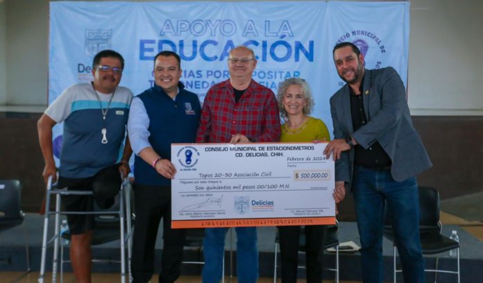 Delicias.- El Gobierno Municipal de Delicias y Consejo Municipal de Estacionómetros realizaron una entrega significativa de un donativo destinado a becas estudiantiles para los jóvenes pertenecientes a la Asociación Topos 20-30 de la Escuela Preparatoria Activo 20-30 Albert Einstein.