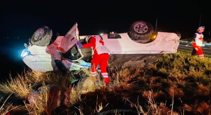 Meoqui.- Una fuerte volcadura se registró esta noche sobre la carretera a Delicias cerca de Lázaro Cárdenas, lo que dejó al menos a una persona lesionada y cuantiosos daños materiales.