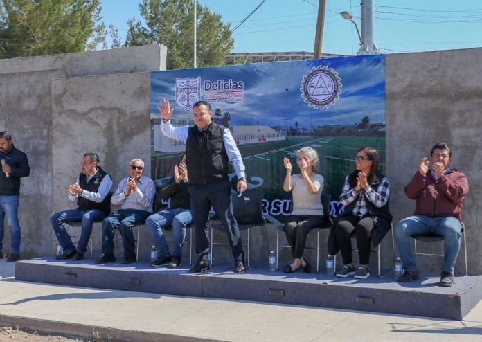 Delicias.- Este mediodía, se llevó a cabo la colocación de la primera piedra para la construcción de las gradas del campo de fútbol americano de la Escuela Preparatoria Activo 20-30 Albert Einstein. El evento fue encabezado por el alcalde Jesús Valenciano, quien estuvo acompañado por directivos y alumnos del plantel.