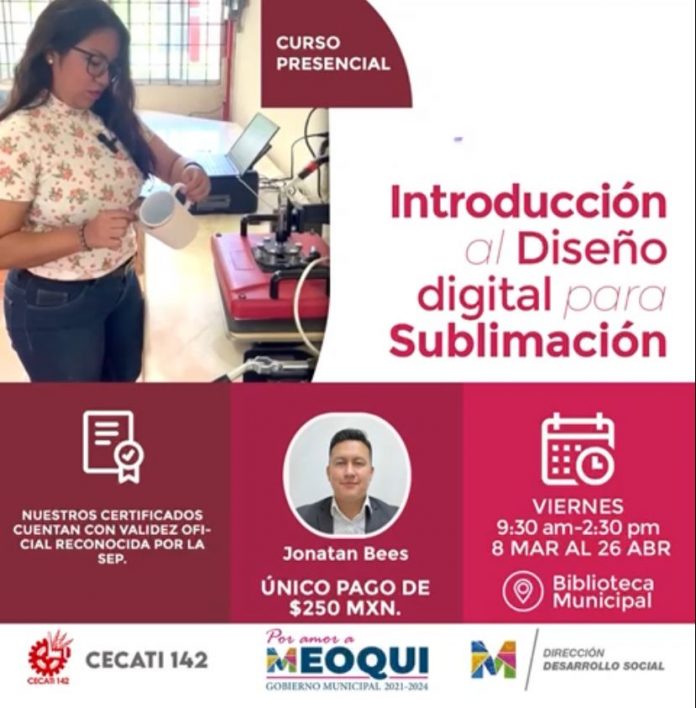 “Hacer la invitación para formar parte del próximo curso de introducción al diseño digital para sublimación, se lleva a cabo en coordinación con CECATI 142, y gracias al convenio que se firmó entre Gobierno Municipal, a cargo de la alcaldesa Miriam Soto y CECATI, los meoquenses que deseen formar parte de estos cursos y talleres, tienen la ventaja que el curso de inscripción es mucho menos, en este caso será un pago único de 250 pesos”