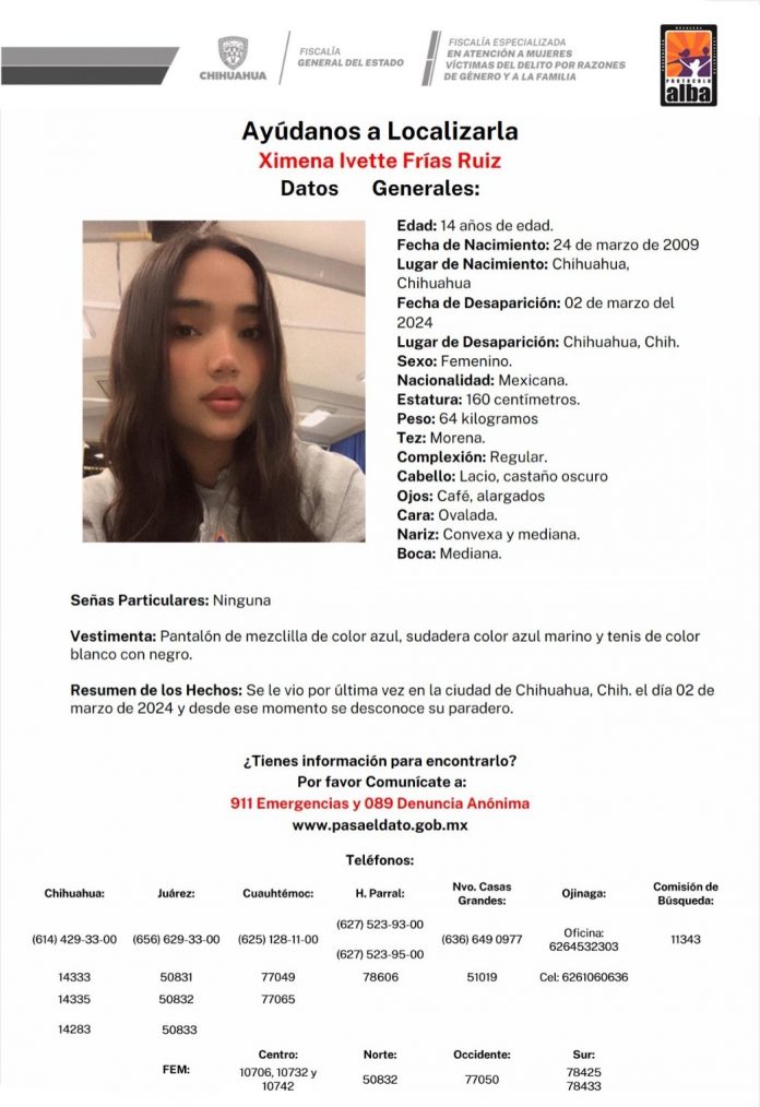 Chihuahua.- La joven Ximena Ivette Frías Ruiz, de 14 años de edad, desapareció en la ciudad de Chihuahua el pasado 2 de marzo. La Fiscalía publicó su pesquisa.