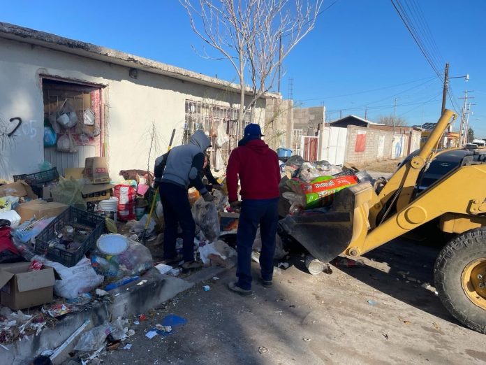 Delicias.- Este fin de semana, personal de Servicios Públicos junto con otras autoridades municipales, atendieron un urgente llamado en la Loma de Pérez, donde una vivienda se encontraba saturada de basura doméstica, provocando riesgos para la salud pública y la seguridad de los residentes y vecinos.