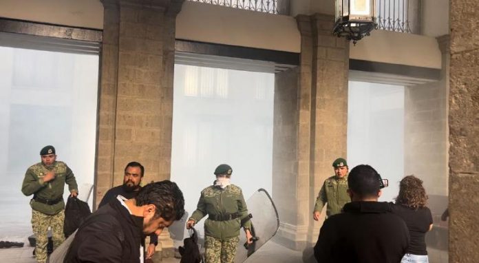 México.- Manifestantes que exigen justicia por el caso de los estudiantes desaparecidos de Ayotzinapa irrumpieron por la fuerza en Palacio Nacional. Los protestantes llenaron el establecimiento con bombas de humo, provocando una situación de caos y tensión en el lugar.