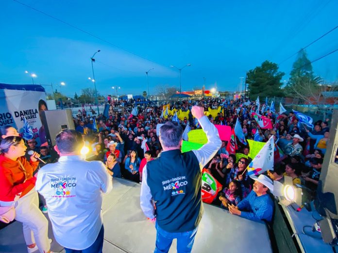 Cientos de familias se reunieron en la plaza principal de colonia Revolución en Delicias para manifestar su respaldo a las propuestas que impulsan Daniela Álvarez, Mario Vázquez y Tony Meléndez.
