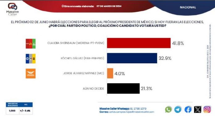De acuerdo con la reciente medición de la encuestadora Massive Caller, en relación a las elecciones presidenciales de este 2024, la candidata de Morena a la presidencia de la República, Claudia Shienbaum, lidera las preferencias con un 41.8% de los votos.