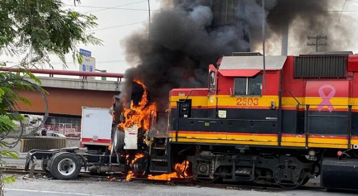 La locomotora volvió a avisar que se acercaba, pero fue demasiado tarde ya que tuvo una fuerte colisión en contra del tractocamión, causando una leve explosión y arrastrando el vehículo algunos metros.