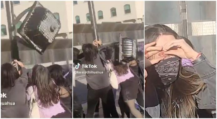 Chihuahua.- Una lámpara de gran peso le cayó en la cabeza a una jovencita cuando junto a otras feministas vandalizaba un poste de alumbrado en Plaza de Armas de la ciudad de Chihuahua, durante las protestas del 8M. A una segunda le lastimó el ojo.