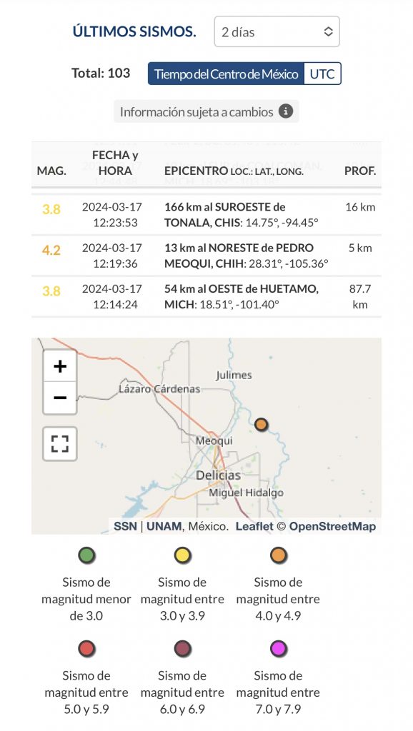 El SSM refiere que en las últimas 24 horas es el único sismo registrado en la región de Chihuahua.
