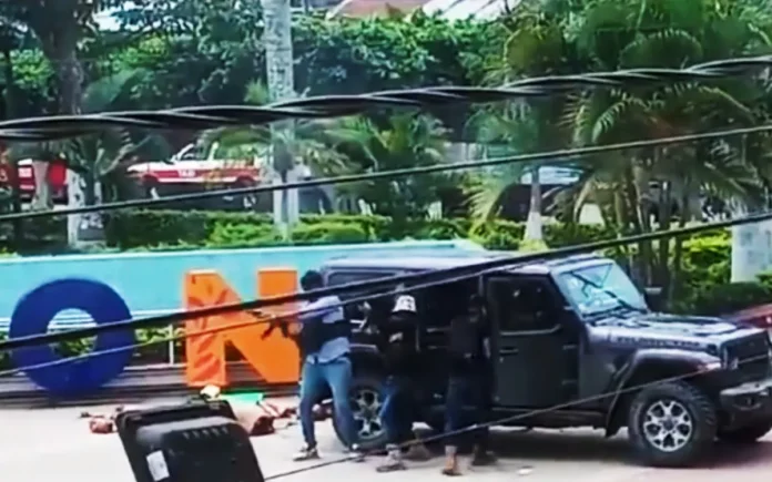 Se aprecia a cuatro sujetos armados, encapuchados y con ropa táctica descender de un Jeep negro.