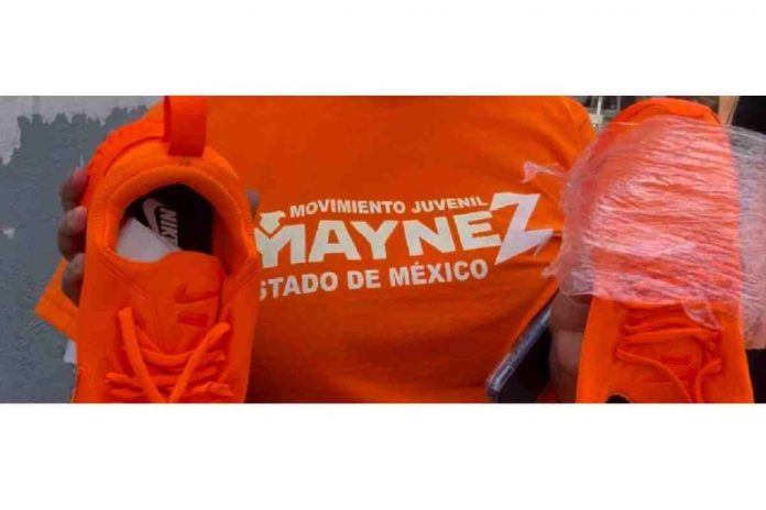 Unos minutos antes de la llegada de Álvarez Máynez, desde una camioneta blanca, múltiples asistentes del evento recibieron tenis fosfo fosfo o color naranja fosforescente, que un joven con playera anaranjada sacaba de una bolsa transparente de plástico.