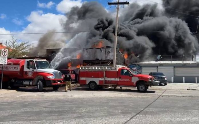 Cuauhtémoc.- Un voraz incendio dejó importantes pérdidas materiales al consumir una importante cantidad de neumáticos en desuso, así como diversa herramienta en un negocio ubicado en las avenidas Américas y Colombia de la colonia CTM de la ciudad de Cuauhtémoc, en donde afortunadamente no se reportan personas fallecidas o lesionadas.
