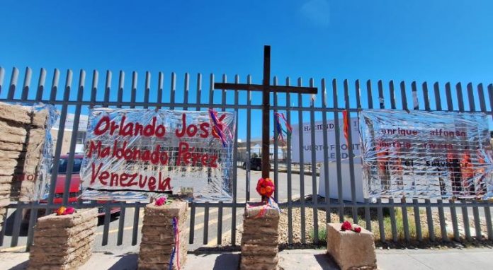 Ciudad Juárez.- Miembros del Centro de Derechos Humanos Paso del Norte A. C. colocaron al exterior del Instituto Nacional de Migración (INM) en Ciudad Juárez una cruz por el aniversario de la tragedia donde fallecieron 40 extranjeros.