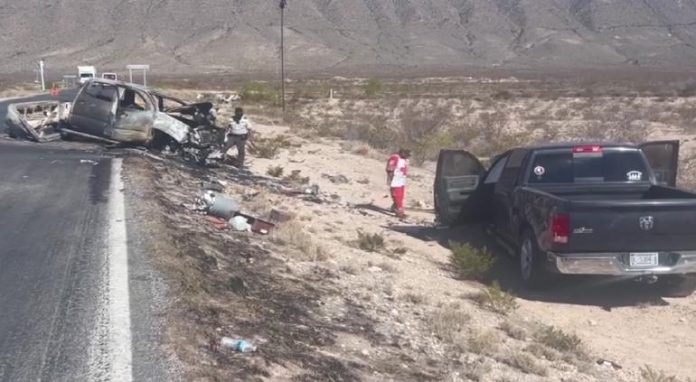 Ojinaga.- Una mujer perdió la vida al quedar atrapada en el interior de una pick up Tacoma que se incendió tras chocar de frente contra una pick up Ram, en hechos suscitados sobre la carretera que conduce al municipio de Ojinaga.