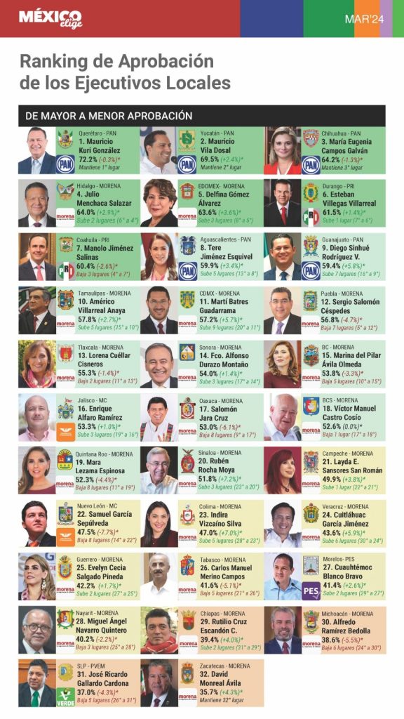En el primer sitio del ranking se encuentra el gobernador de Querétaro, Mauricio Kuri González, con un 72.2 por ciento de aprobación y en el segundo, Mauricio Vila Dosal, de Yucatán, con un 69.5 por ciento de aprobación.